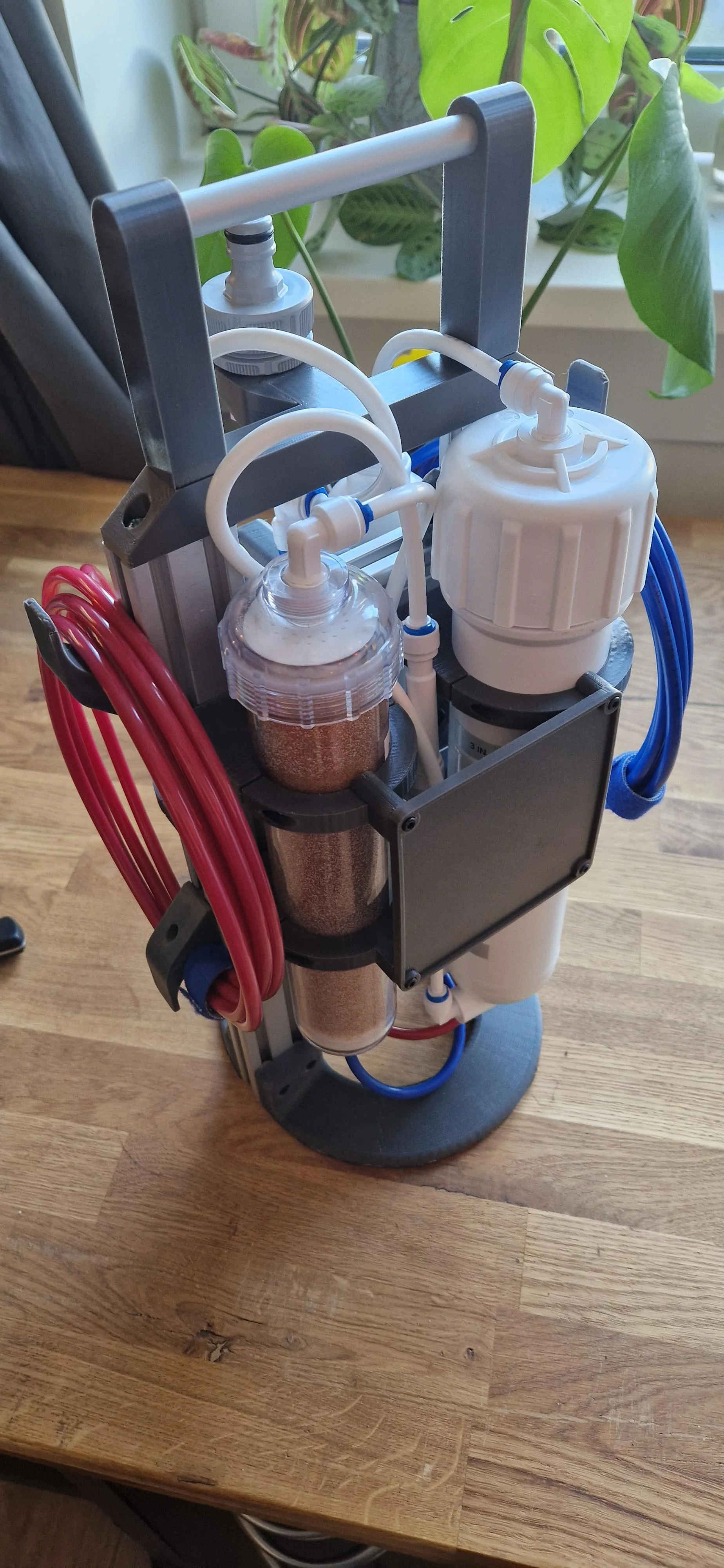 dit ontwerp maak gebruikt van een alluminium frame en brackets gemaakt van abs. middels een reguliere tuinslang kan dit filter op vrijwel iedere kraan in huis worden aangesloten, de 2 slangen voor schoon en vies water kunnen eenvoudig worden opgeborgen